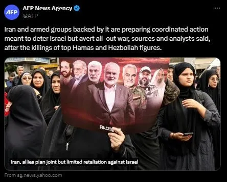 AFP haber ajansı; Haniye ve Hizbullah'ın önde gelen isimlerinin öldürülmesinin ardından İran'ın İsrail'i caydırmak ve topyekün savaşı önlemek için koordineli bir eylem hazırlığında olduğunu söyledi.