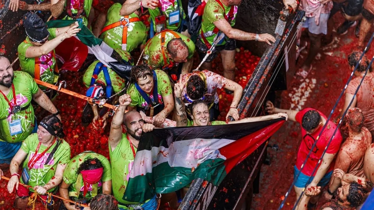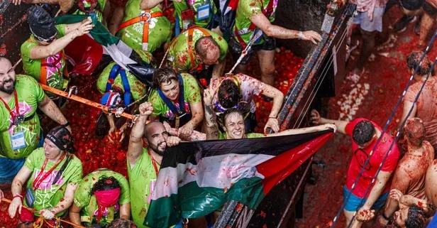İspanya’da binlerce kişinin katıldığı domates festivalinde Filistin’e destek! Dev bayraklar açıldı