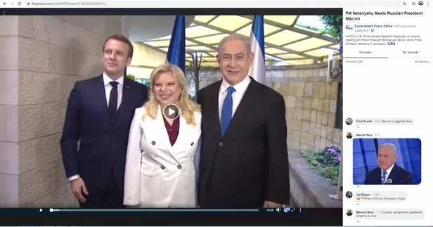 Basın ofisinin Facebook sayfasında Netanyahu ve eşi Sara'nın, Başbakanlık Ofisinde Macron'u karşılaması canlı olarak yayınlandı.