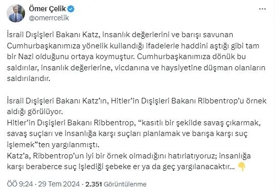 AK Parti sözcüsü Ömer Çelik ise Katz'ın skandal paylaşımına şu sözlerle tepki gösterdi: