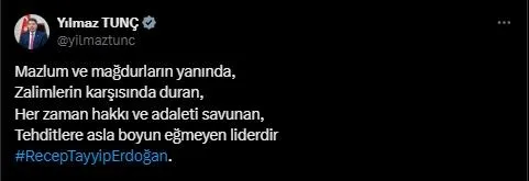 Adalet Bakanı Yılmaz Tunç, "Mazlum ve mağdurların yanında, zalimlerin karşısında duran, her zaman hakkı ve adaleti savunan, tehditlere asla boyun eğmeyen liderdir." dedi.