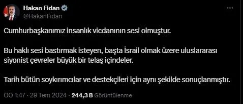 Fidan, sosyal medya hesabından yaptığı paylaşımda, "Bu haklı sesi bastırmak isteyen, başta İsrail olmak üzere uluslararası siyonist çevreler büyük bir telaş içindeler. Tarih bütün soykırımcılar ve destekçileri için aynı şekilde sonuçlanmıştır" ifadelerine yer verdi.