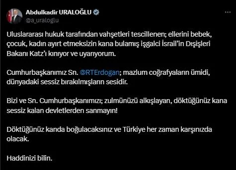 Ulaştırma ve Altyapı Bakanı Abdulkadir Uraloğlu, "Uluslararası hukuk tarafından vahşetleri tescillenen; ellerini bebek, çocuk, kadın ayırt etmeksizin kana bulamış işgalci İsrail'in Dışişleri Bakanı Katz'ı kınıyor ve uyarıyorum.