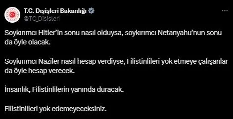 Dışişleri Bakanlığı, "Soykırımcı Hitler'in sonu nasıl olduysa, soykırımcı Netanyahu'nun sonu da öyle olacak. Soykırımcı Naziler nasıl hesap verdiyse, Filistinlileri yok etmeye çalışanlar da öyle hesap verecek. İnsanlık, Filistinlilerin yanında duracak. Filistinlileri yok edemeyeceksiniz." ifadelerini kullandı.