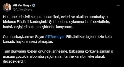 İçişleri Bakanı Ali Yerlikaya, "Hastaneleri, sivil kampları, camileri, evleri ve okulları bombalayıp binlerce Filistinli kardeşimizi Şehit eden soykırımcı israil devletinin, hadsiz dışişleri bakanını şiddetle kınıyorum. Cumhurbaşkanımız Sayın Recep Tayyip Erdoğan Filistinli kardeşlerimizin kolu kanadı, haykıran sesi olmuştur. Tüm dünyanın gözleri önünde, annesine, babasına korkuyla sarılan o masum çocuklara bomba yağdıranlar, tarihe kara bir leke olarak geçeceklerdir." dedi.