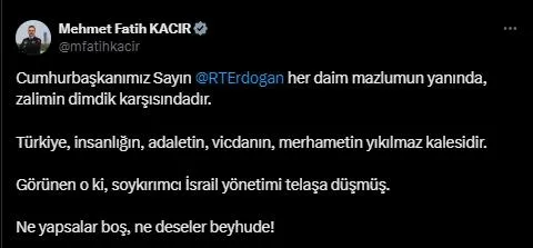 Sanayi ve Teknoloji Bakanı Mehmet Fatih Kacır, "Cumhurbaşkanımız Sayın Recep Tayyip Erdoğan her daim mazlumun yanında, zalimin dimdik karşısındadır. Türkiye, insanlığın, adaletin, vicdanın, merhametin yıkılmaz kalesidir. Görünen o ki, soykırımcı İsrail yönetimi telaşa düşmüş. Ne yapsalar boş, ne deseler beyhude! İşledikleri suçların hesabını tarih ve insanlık önünde er ya da geç muhakkak verecekler." dedi.
