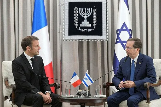 İsrail Cumhurbaşkanı Isaac Herzog, Başbakan Benjamin Netanyahu, eski Savunma Bakanı Benny Gantz ve ana muhalefet lideri Yair Lapid ile görüşmek üzere bu sabah Tel Aviv'e inen Macron, Fransa'nın soykırımcı İsrail'e tam desteğini dünyaya duyuruyor.