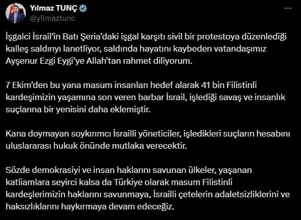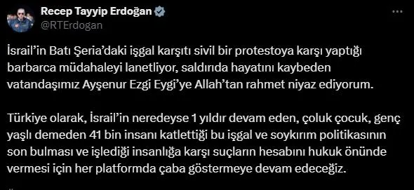 "İsrail'in Batı Şeria'daki işgal karşıtı sivil bir protestoya karşı yaptığı barbarca müdahaleyi lanetliyor, saldırıda hayatını kaybeden vatandaşımız Ayşenur Ezgi Eygi'ye Allah'tan rahmet niyaz ediyorum. Türkiye olarak, İsrail'in neredeyse 1 yıldır devam eden, çoluk çocuk, genç yaşlı demeden 41 bin insanı katlettiği bu işgal ve soykırım politikasının son bulması ve işlediği insanlığa karşı suçların hesabını hukuk önünde vermesi için her platformda çaba göstermeye devam edeceğiz."