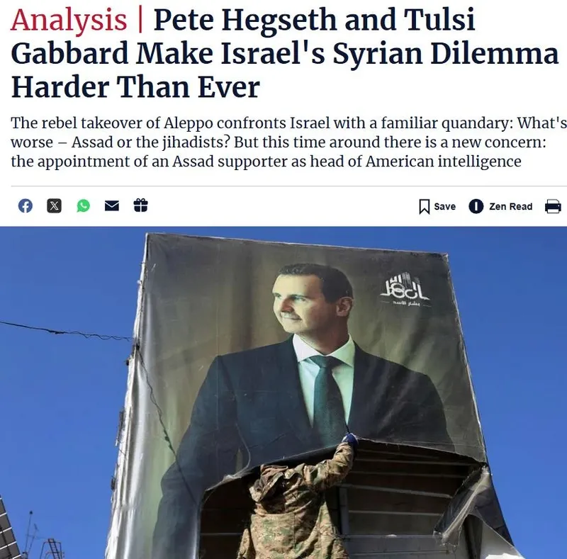 Tulsi Gabbard ise bir Demokratlara bir Cumhuriyetçilere yakın olan zikzaklı çizgisi ile dikkat çekerken İsrail basınında dikkat çekti. Her iki ismin de İsrail için belirsiz bir geleceğin işareti olduğunu belirtti ve tüm bunların Lübnan'da ateşkesin belirsiz olduğu, Hamas'ın elinde hala rehinelerin olduğu bir döneme denk geldiğini bu sebeple de Suriye'nin İsrail için çıkmaz olduğunu belirtti.