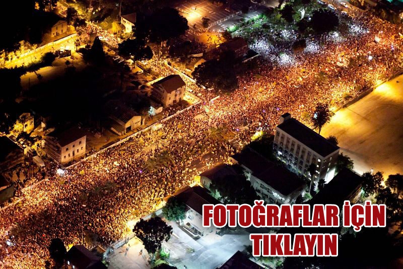 Tel Aviv'de çoğu orta gelir grubundan binlerce gösterici, ellerinde bayraklarla ve davullar çalarak, caddelerde yürüdü ve "Halk için sosyal adalet" ve "devrim" sloganları attı. Bazı göstericiler ellerinde, "Kazançlardan önce halk", "Kira, bir lüks değildir", "İsrail çok pahalı" ve "İşçi sınıfının kahramanları" yazılı pankartlar taşıdı.