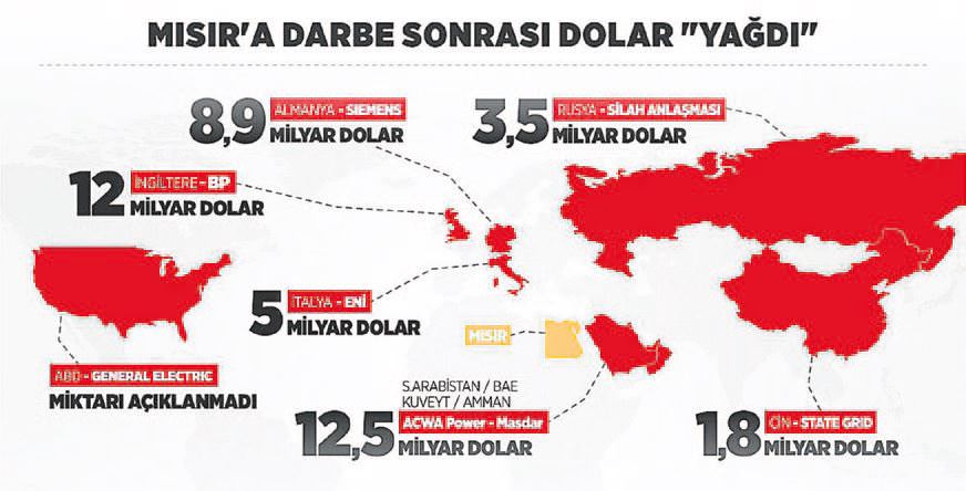 Mısır, 3 Temmuz günü tarihine kara leke olarak geçecek bir olaya ev sahipliği yaptı. ABD ve İsrail'in adamı General Sisi, Mısır tarihinin ilk seçilmiş Cumhurbaşkanı olan Mursi'yi darbe ile görevden el çektirdi. Büyük sorunlar yaşayan Mısır'a o tarihten sonra paralar akmaya başladı. 10 Temmuz 2013'ten itibaren tam 138 milyar doları bulan anlaşmalara imza konulurken, bu anlaşmaların 12,5 milyar doları Körfez bölgesindeki ülkelerle yapıldı. İngiltere, Mısır'a yatırım tutarını, 2014'te bir önceki yıla göre yüzde 30 artırırken, Dışişleri Bakanı Philip Hammond ile BP, BG, Vodafone ve WHSmith gibi şirketlerin üst düzey yöneticilerinden oluşan heyet, bu yılın Mart ayında Mısır'da ekonomik ve ticari ilişkileri geliştirmeye yönelik temaslarda bulundu. Mısır'ın petrol üretiminin yüzde 15'ini ve doğalgaz üretiminin ise yaklaşık yüzde 30'unu gerçekleştiren, darbe sonrası bu ülkeye en çok yatırım kararı alan şirketlerin başında gelen İngiliz petrol şirketi BP, Sisi'nin yönetime gelmesinin ardından 12 milyar dolar değerinde enerji anlaşması imzaladı.
