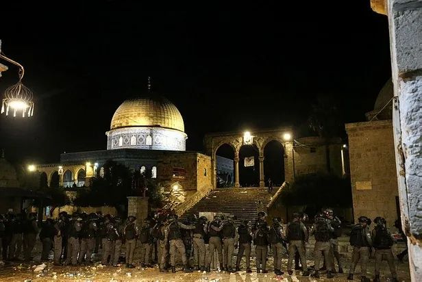 Fakat hepimizin takip ettiği gibi olaylarda eninde sonunda Mescid-i Aksa'da alanda ve bulunan değişik mescit ve camilerde namaz kılan Müslümanlara, İsrail'in belli ki gözdağı vermek için ve bu arada Kudüs'ün değişik yerlerinde Müslümanların ellerinden alma girişimlerine ses çıkarmalarını önlemek için askerlerle polislerle yaptığı bir baskın var. Ve burada gereksiz yere plastik mermi de olsa silah kullanılması ve orada iftar sonrası ibadet eden belki sohbet eden bazıları da teravih kılan insanlara yapılan çok ağır bir saldırı var.