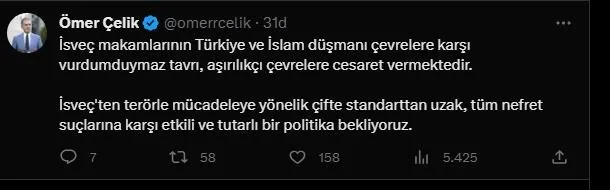 AK Parti Genel Başkan Yardımcısı ve Parti Sözcüsü Ömer Çelik, İsveç'ten terörle mücadeleye yönelik çifte standarttan uzak, tüm nefret suçlarına karşı etkili ve tutarlı bir politika beklediklerini bildirdi.