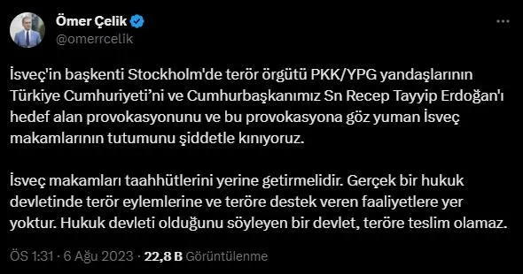 "İsveç'in başkenti Stockholm'de bugün gerçekleşen terör örgütü PKK destekçilerinin Sayın Cumhurbaşkanı'mızı hedef alan provokasyonunu en şiddetli şekilde kınıyorum. İsveç'in terör örgütlerinin faaliyetlerine müsaade etmesi, Sayın Cumhurbaşkanı'mıza yönelik provokasyonlara sessiz kalması kabul edilemez. NATO'da müttefikimiz olmak isteyen İsveç'in, terör örgütlerinin faaliyetlerine izin vermeyerek taahhütlerine sadık kalması gerekir. Terör bir insanlık suçudur. Terör örgütlerinin her türlü eylemlerine engel olunması hukuk devletlerinin asli görevidir."