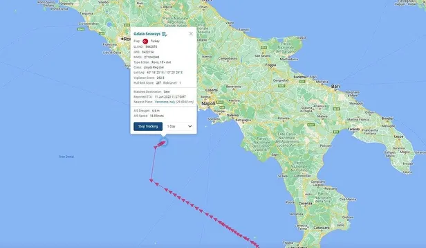 MarineTraffic isimli internet sitesinin verilerine göre de gemi, Napoli limanı açıklarında bulunuyor.