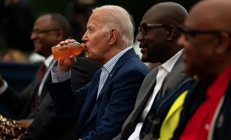 Biden'ın konuşmaya başlamadan önce enerji içeceğine benzeyen kırmızı bir sıvı içtiği görüldü.