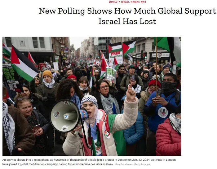 Times, Morning Consult'un paylaştığı verilerde soykırımcı İsrail'in 7 Ekim'den bu yana dünya çapında desteğinin düştüğü ortaya çıktı. Eylül-Aralık ayları arasında soykırımcı İsrail'in desteğinin küresel olarak yüzde 18,5 oranında düşüş gösterdiğini belirtirken NBC News ise soykırımcının en büyük destekçisi ile de arasında çatlak oluştuğuna dikkat çekti. ABD-İsrail arasındaki büyük çatlak terör devletinin en büyük desteğini kaybetmesine kadar varacak.