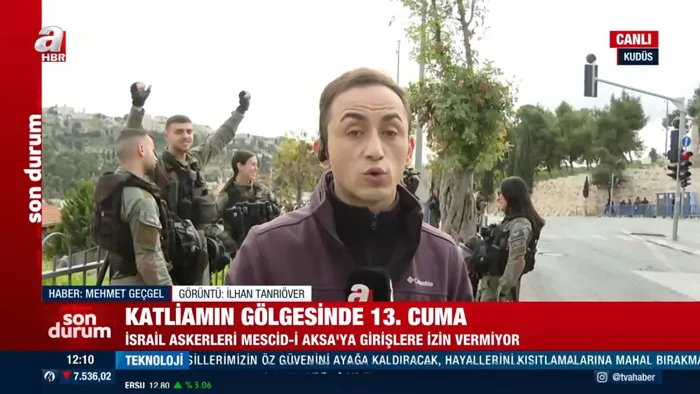 Bugün biraz daha sakin geçmesini beklerken gerilim bir anda tırmandı, tansiyon arttı ve namaz kılan Müslüman gençlerin üzerine biber gazları, ses bombası atıldı. Hatta namazı bırakmayan 2-3 kişi de İsrail polisinin coplu müdahalesine maruz kaldı. 13. cumada da tablo değişmedi.
