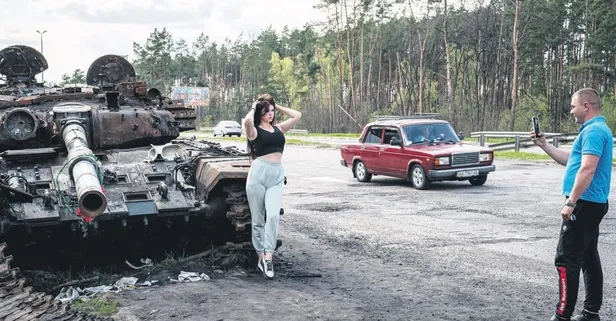 Kiev vatandaşlarında moral pozu! İmha edilen Rus savaş araçları ile hatıra fotoğrafları çekildiler