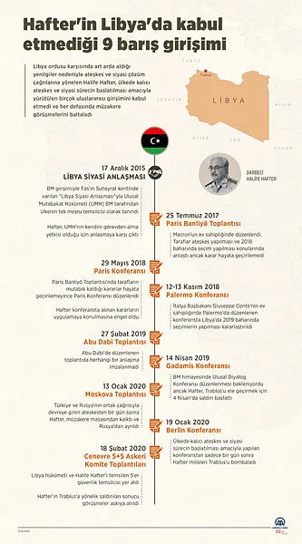 Libya'nın doğusundaki gayrimeşru silahlı güçlerin lideri Hafter, ülkedeki krize çözüm bulmak için Aralık 2015'te "Libya Siyasi Anlaşması" ile başlayan ve günümüze kadar gerçekleştirilen pek çok uluslararası girişimi akamete uğrattı, ateşkes anlaşmalarını hiçe sayarak saldırılarına devam etti.