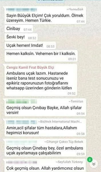Tursunbekov dostluk grubunda Türkiye Cumhuriyeti Bişkek Büyükelçisi Cengiz Kamil Fırat'a seslenerek, "Sayın Büyükelçi, Çok yoruldum. Ölmek üzereyim. Hemen Türkiye. Uçak hemen. İmdat. Hemen kalksın" mesajı attı. Büyükelçi Fırat da cevaben, "Ambulans uçak lazım. Hastanedeyseniz, bana test sonucunuzu ve epikiriz raporunuzun fotoğraflarını gönderin lütfen" karşılığını verdi.
