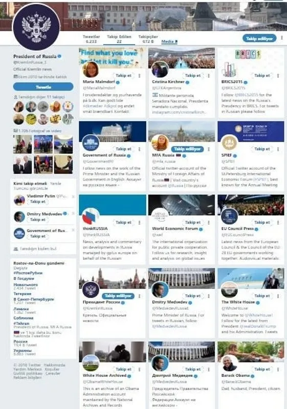 Rusya Devlet Başkanı Vladimir Putin’in tüm resmi çalışmalarını duyuran Kremlin’in resmi Twitter hesabından ABD Başkanı Donald Trump değil eski başkan Barack Obama takip ediliyor.