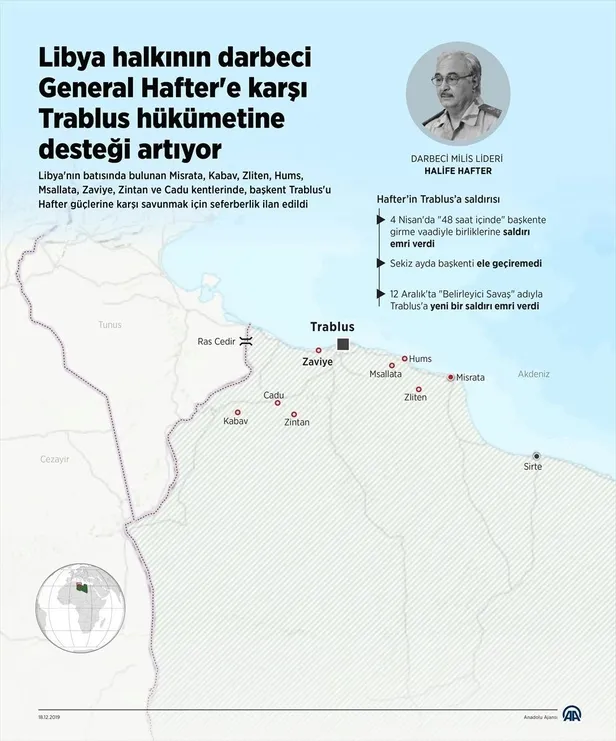 Ülkenin doğusundaki darbeci General Hafter'in, 4 Nisan'da Trablus'u "48 saat içinde" ele geçirmeleri için birliklerine saldırı emri vermesiyle, Libya şiddet sarmalına sürüklendi. Aradan geçen sekiz ayda başkenti ele geçirmekte başarısız olan Hafter, son olarak 12 Aralık'ta Trablus'a yönelik "Belirleyici Savaş" adıyla yeni bir saldırı talimatı verdi.