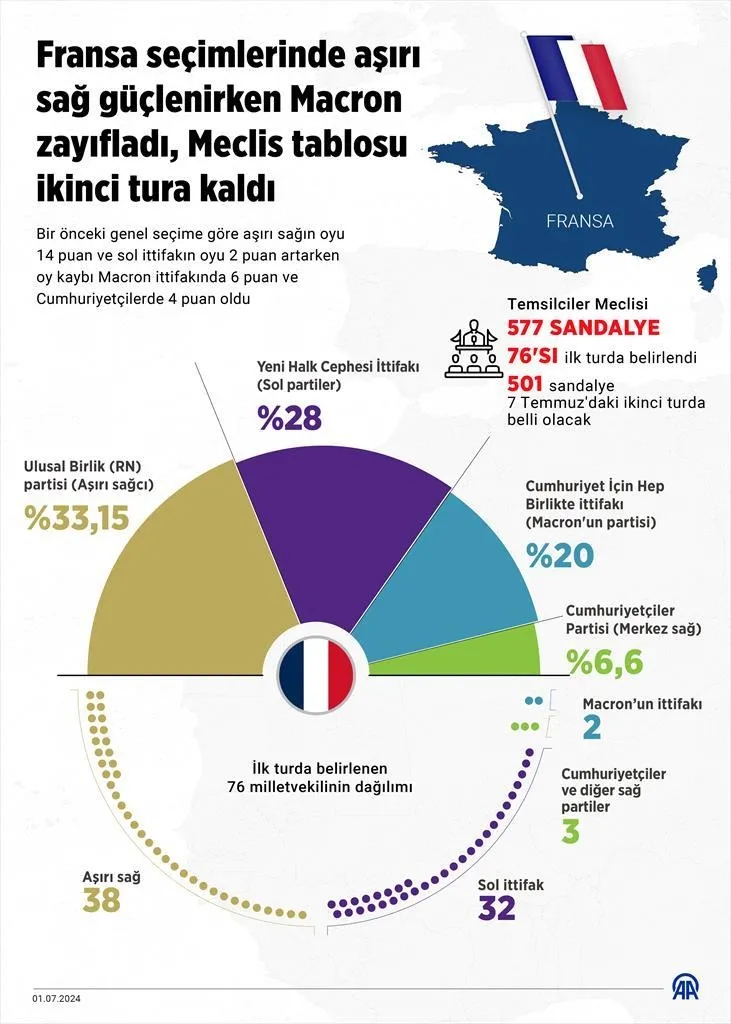 Fransa'da son 3 seçimdir oylarını artırmaya devam eden aşırı sağcı RN, 9 Haziran'daki Avrupa Parlamentosu (AP) seçimlerinde yüzde 31,4 oy alarak en yakın rakibi olan Macron'un partisi Rönesans'ı ikiye katlamıştı. Aşırı sağın zaferinin ardından Macron erken seçim kararı almıştı.