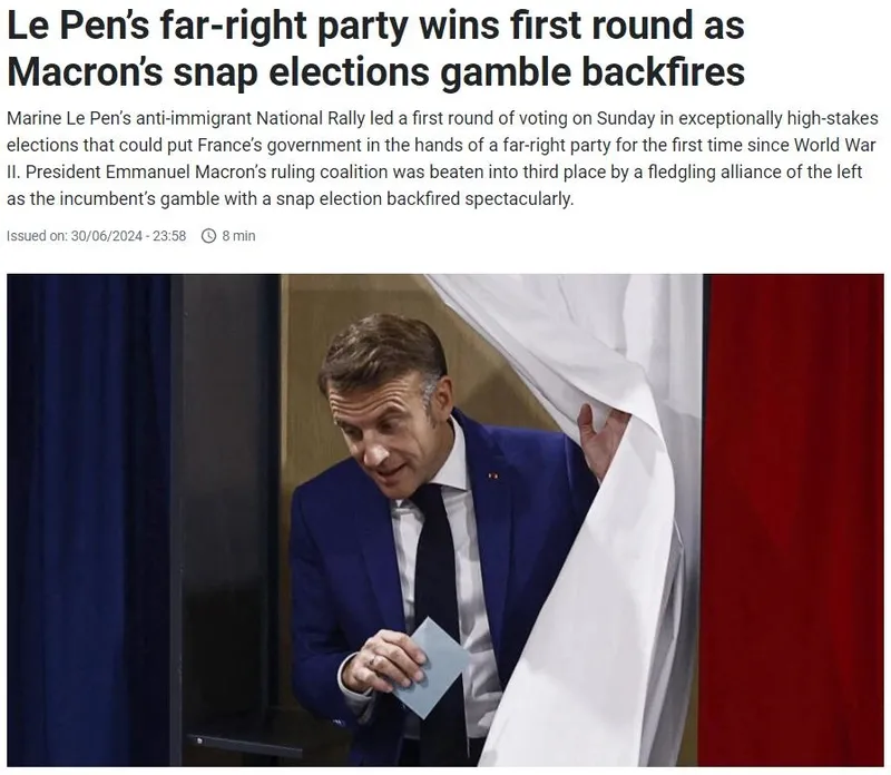 Kamu yayıncısı Franceinfo ilk turun sonuçlarını derlediği haberde, aşırı sağcı RN partisinin seçimin ilk turuna hakim olduğunu aktarırken "Emmanuel Macron'un Ulusal Meclis'in feshedildiğini açıklamasından 3 hafta sonra, erken genel seçimlerin ilk turu aşırı sağ parti ve müttefikleri açısından benzeri görülmemiş bir başarı teşkil ediyor." değerlendirmesine yer verildi.