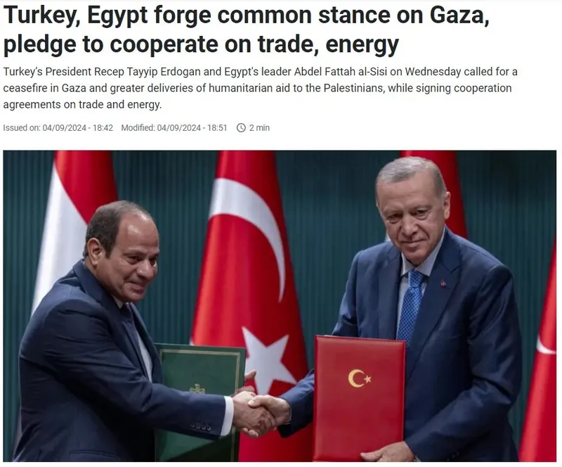Fransız France 24 ise "Türkiye ve Mısır, Gazze konusunda ortak tavır belirledi, ticaret ve enerji konusunda iş birliği sözü verdi" dedi.