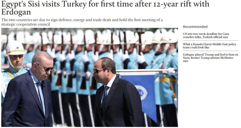 Londra merkezli Middle East Eye "Mısır'ın Sisi'si Erdoğan'la 12 yıllık anlaşmazlığın ardından ilk kez Türkiye'yi ziyaret ediyor" dedi.