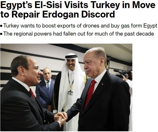 ABD merkezli Bloomberg, "Mısır'ın El-Sisi'si Erdoğan'la anlaşmazlığı onarmak için Türkiye'yi ziyaret etti" dedi ve Sisi ile Başkan Erdoğan'ın son dönemde gerilen ilişkileri onarmak ve enerji, savunma ve Gazze konusunda daha yakın iş birliği yapmak istediğini belirtti.