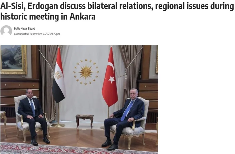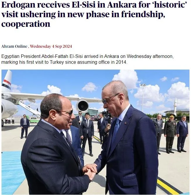 Mısır hükümetinin resmi gazetesi Ahram Online ise Başkan Erdoğan'ın on iki yıl sonra ilk kez Türkiye'ye gelen Sisi'yi Esenboğa Havalimanı'nda karşıladığını belirtirken El-Sisi'nin çarşamba günü resmi Facebook sayfasından yaptığı açıklamada, "Türkiye Cumhuriyeti'ne ilk ziyaretimi yapmaktan ve Başkan Recep Tayyip Erdoğan ile görüşmemden büyük mutluluk duyuyorum." şeklindeki açıklamasına vurgu yaptı.