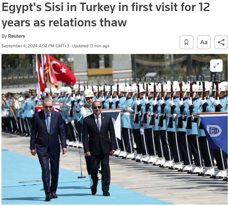 Reuters, "Sisi, ilişkilerin düzelmesiyle 12 yıl aradan sonra ilk kez Türkiye'ye geldi" dedi ve Başkan Erdoğan ile Sisi görüşmesinde Gazze'nin masada olacağına dikkat çekti.