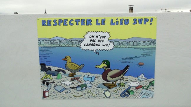İsviçre'nin Cenevre şehrindeki bir plajda çevre kirliliğine ilişkin mesajların verildiği karikatürlerin birinde yer alan 'terörist Müslüman' imajı dikkat çekti.
