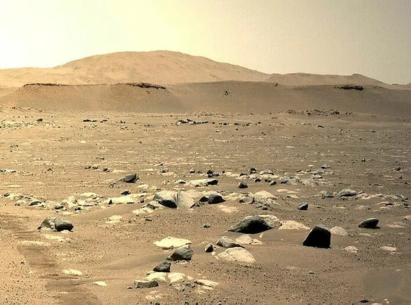 NASA, Ingenuity'den gelen fotoğrafları da paylaşıyor. Kareler, Mars'ın yüzeyindeki kızıllığı gösteriyor. Alt tarafta Ingenuity'nin gölgesi de görülüyor.
