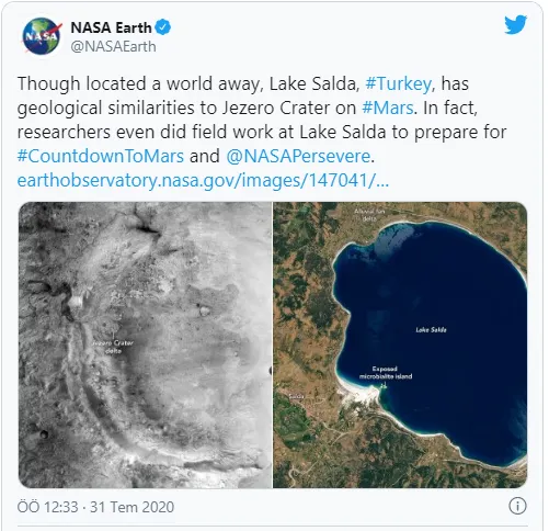 NASA, sosyal medya üzerinden Salda Gölü ve Jezero Krateri'nin yan yana fotoğraflarını da paylaştı.