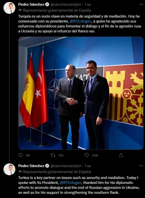 Başbakan Sanchez, ayrıca Cumhurbaşkanı Recep Tayyip Erdoğan ile ikili görüşmesinin ardından resmi Twitter hesabından yaptığı paylaşımda şu ifadeleri kullandı: