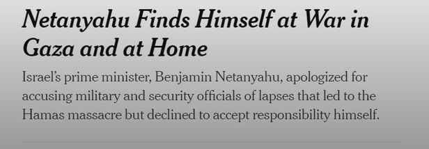 Yıkıcı bir istihbarat başarısızlığı, rehine krizi ve başarıya ulaşamadıkları savaşın ardından hedef tahtasına konan İsrail Başbakanı Benjamin Netanyahu, pazar günü yaptığı açıklamada, İsrail'in savunma ve istihbarat hizmetlerini açıkça suçladı. 29 Ekim Pazar günü sosyal medya hesabında yaptığı paylaşımda askeri ve güvenlik şeflerinin Hamas'ın 7 Ekim'deki sürpriz saldırısına ilişkin kendisine herhangi bir uyarıda bulunmadığını söylediğini belirtti ve suçu üzerinden atmaya çalıştı.