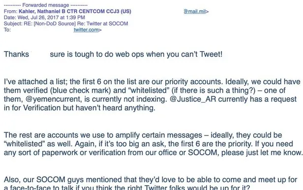 Fang'ın paylaştığı CENTCOM'da görevli Nathaniel Kahler'a ait, 26 Temmuz 2017 tarihli yazışmada, Kahler şirketin kamu politikası ekibinden bir yetkiliye "ABD'in belirli mesajları daha güçlü yaymak için kullandığı" bir Arapça hesap listesini ileterek bunlardan birine "onaylı hesap işareti" verilmesini ve diğer hesaplara ise "beyaz liste" olarak bilinen şikayet ve siber müdahalelere karşı koruma sağlaması talebinde bulunuyor.