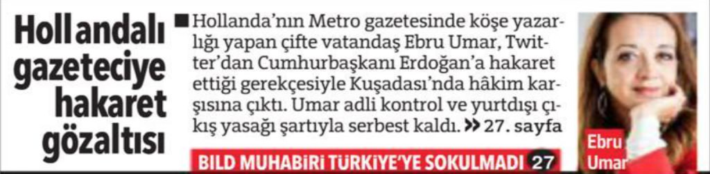 Kuşadası'nda gözaltına alınan ve ardından serbest bırakılan Türk kökenli Hollandalı gazeteci Ebru Umar Hz.Peygamber'e hakaret etti. Başta Hürriyet gazetesi olmak üzere FETÖ medyası Hollandalı gazetecinin Peygamberimize çirkin küfürlerini görmedi. Olayı sadece Erdoğan'a hakaret gibi gösteren Doğan ve FETÖ medyası Umar'a sahip çıktı.