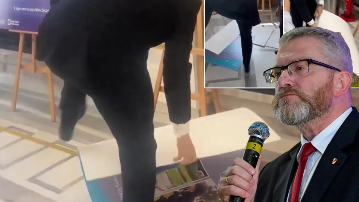 Avrupa Parlamentosu Milletvekili ve Polonya Tacı Konfederasyonu Partisi Genel Başkanı Grzegorz Braun, Polonya'da sapkın LGBT propagandasına izin vermedi. Braun parlamento binasının koridorlarında açılan sergide yer alan tabloları ayaklar altına aldı. Braun, "Kamusal rezaleti engelliyorum." diyerek tabloları kaldırdı.