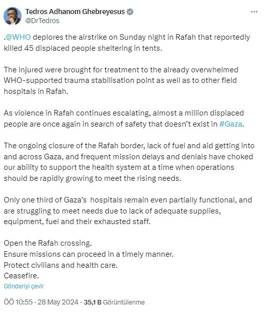 Ghebreyesus, paylaşımında "Refah Sınır Kapısı'nı açın. Görevlilerin zamanında ilerleyebildiğinden emin olun. Sivilleri ve sağlık hizmetlerini koruyun. Ateşkes sağlanmalı." ifadelerine yer verdi.