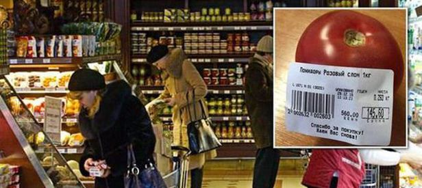 Uçak krizinden sonra Türkiye'ye ambargo uygulayan Rusya'da meyve sebze fiyatları tavan yaptı. Dün markette çekilen bir fotoğrafta domatesin tanesinin 145 rubleye yani yaklaşık 6 liraya satıldığı görüldü.