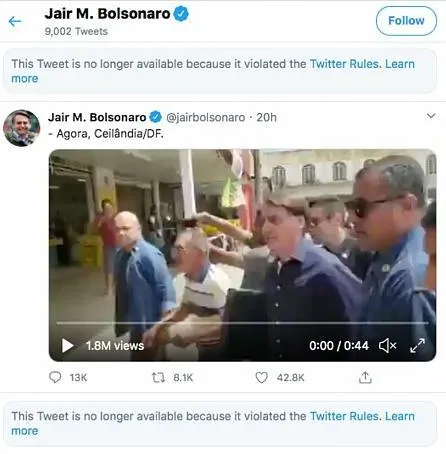 Sosyal medya devleri Facebook, Instagram, WhatsApp ve Twitter'ın "yalan yanlış bilgiler içeren ve insanları provoke eden paylaşımları denetleme" gerekçesiyle başlattığı dijital kısıtlaması, Brezilya Devlet Başkanı Jair Bolsonaro'yu vurdu. Brezilya Devlet Başkanı, karantina önlemlerini eleştirdiği ve bu şekilde büyük bir işsizlik sorunu ile karşılaşırız dediği ve bu gidişle ya Brezilya duracak ya da Venezuela olacak diyerek 'durmayın' çağrısı yaptığı iki videosunu resmi Twitter hesabı üzerinden yayınladı. Fakat videolu iki tweet, Twitter tarafından sansüre uğradı.