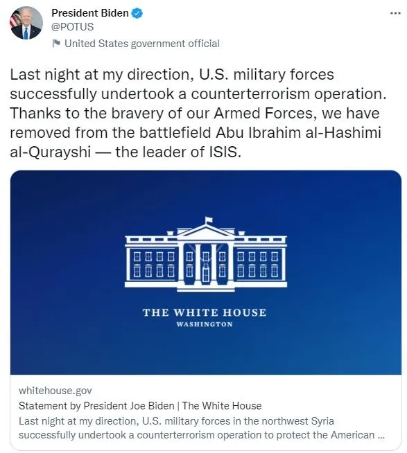 Biden yaptığı yazılı açıklamada, "Dün gece benim talimatımla, kuzeybatı Suriye'deki ABD güçleri, Amerikan halkını ve müttefiklerimizi korumak ve dünyayı daha güvenli bir yer haline getirmek için başarılı bir terörle mücadele operasyonu gerçekleştirdi. Silahlı Kuvvetlerimizin beceri ve cesareti sayesinde, DEAŞ elebaşı Ebu İbrahim el Haşimi el Kureyşi'yi ortadan kaldırdık." ifadesine yer verdi.