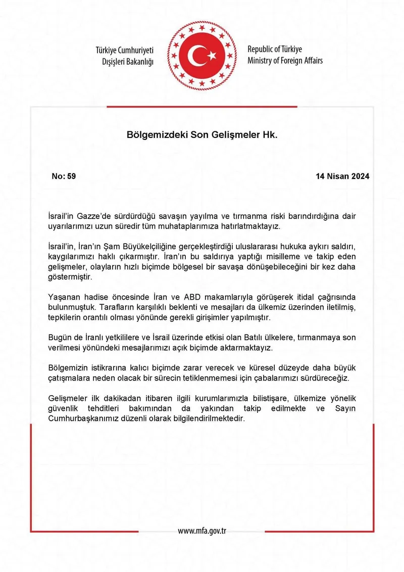 Ankara - Washington - Tahran hattında üst düzey 'misilleme' teması gerçekleşti. İran, İsrail'e saldırmadan önce Türkiye üzerinden ABD ile irtibata geçti. ABD ise İran'a "Belirli sınırlar içinde bir operasyon olsun" şeklinde yanıt verdi. Gelişmeye müteakip Dışişleri Bakanlığı'ndan açıklama geldi. Bakanlıktan yapılan açıklamada "Yaşanan hadise öncesinde İran ve ABD makamlarıyla görüşerek itidal çağrısında bulunmuştuk. Tarafların karşılıklı beklenti ve mesajları da ülkemiz üzerinden iletilmiş, tepkilerin orantılı olması yönünde gerekli girişimler yapılmıştır" ifadelerine yer verildi.