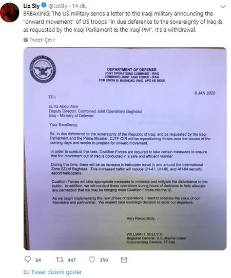 Washington Post'un Beyrut muhabiri Liz Sly, Twitter'dan ABD'nin Iraklı yetkililere gönderdiği mektubu yayınladı.