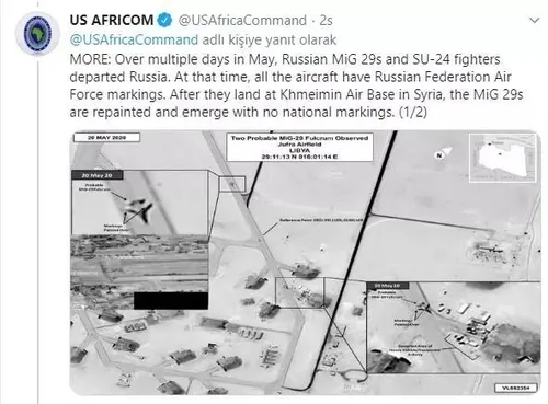 ABD Afrika Kuvvetleri Komutanlığı (AFRICOM), Rusya'nın Libya'ya gönderdiği savaş uçaklarına ilişkin yeni görseller paylaşarak, Suriye'deki Hmeymim Üssü'nde boyanan uçakların başka Rus uçaklarının eşliğinde Libya'ya gönderildiğini bildirdi.
