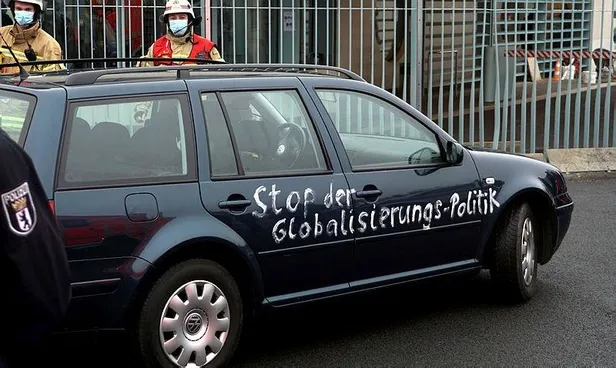 Üzerinde "Lanetlenmiş çocukların ve yaşlıların katilleri" ve "Küreselleşme politikasını durdurun" yazıları yer alan bir araç sabah saatlerinde Başbakanlık binasının ana kapısının demir barikatlarına çarparak durdu.